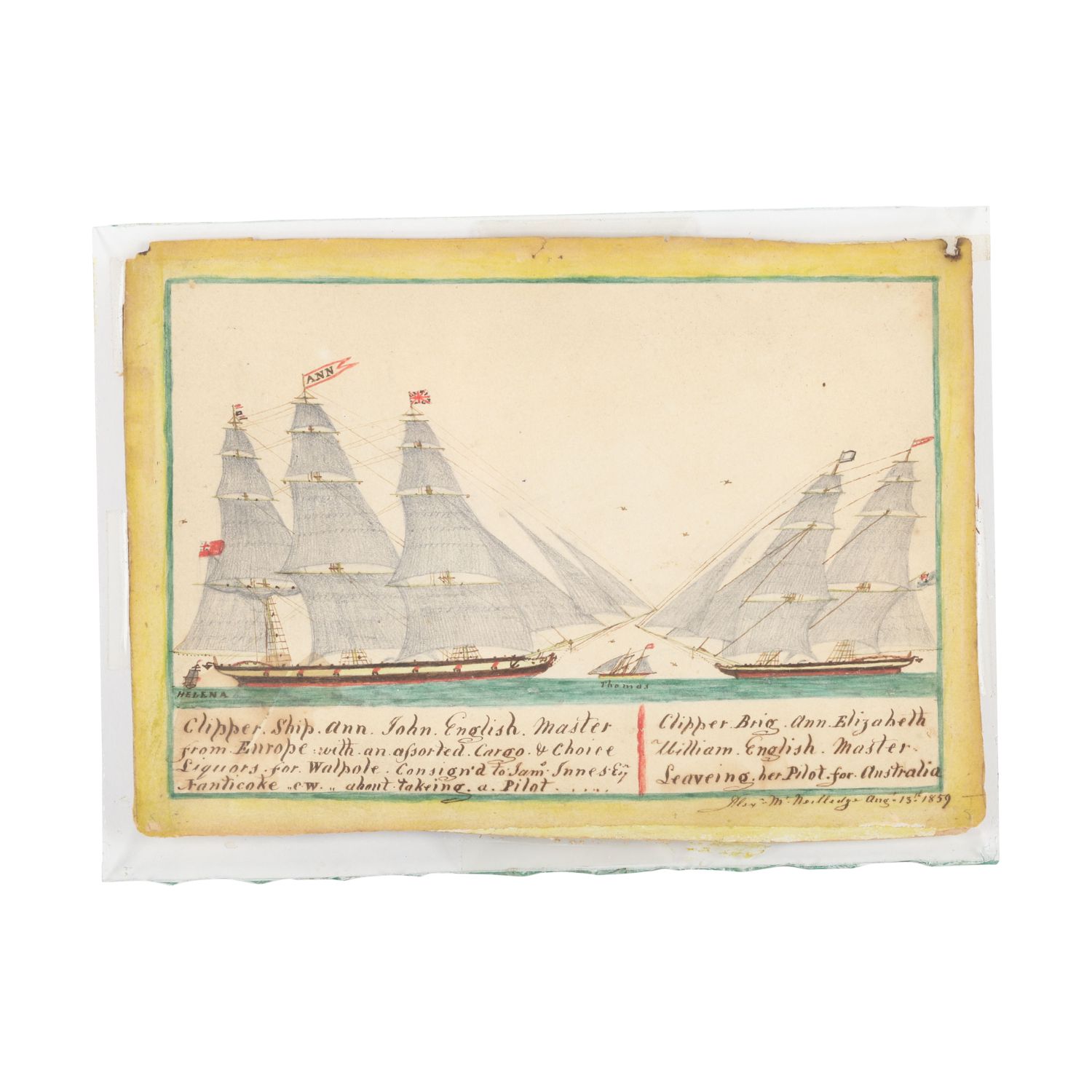 Marine watercolor painted in 1859 in Nanticoke, Ontario, (near Port Dover) by Capt. Alexander McNeilledge (1791-1874). Artist inscribed verso in ink. Estimate: $12,000-$15,000 (Canadian).